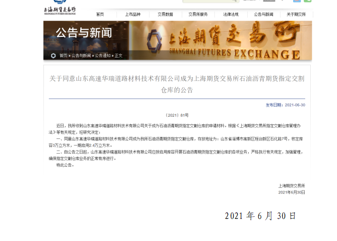 2021年6月30日,上海期貨交易所發(fā)布了《關于同意山東高速華瑞道路材料技術有限公司成為上海期貨交易所石油瀝青期貨指定交割倉庫的公告》,山東高速華瑞道路材料技術有限公司瀝青期貨交割倉庫成功獲批,核準庫容為3萬噸,一期啟用2.4萬噸。